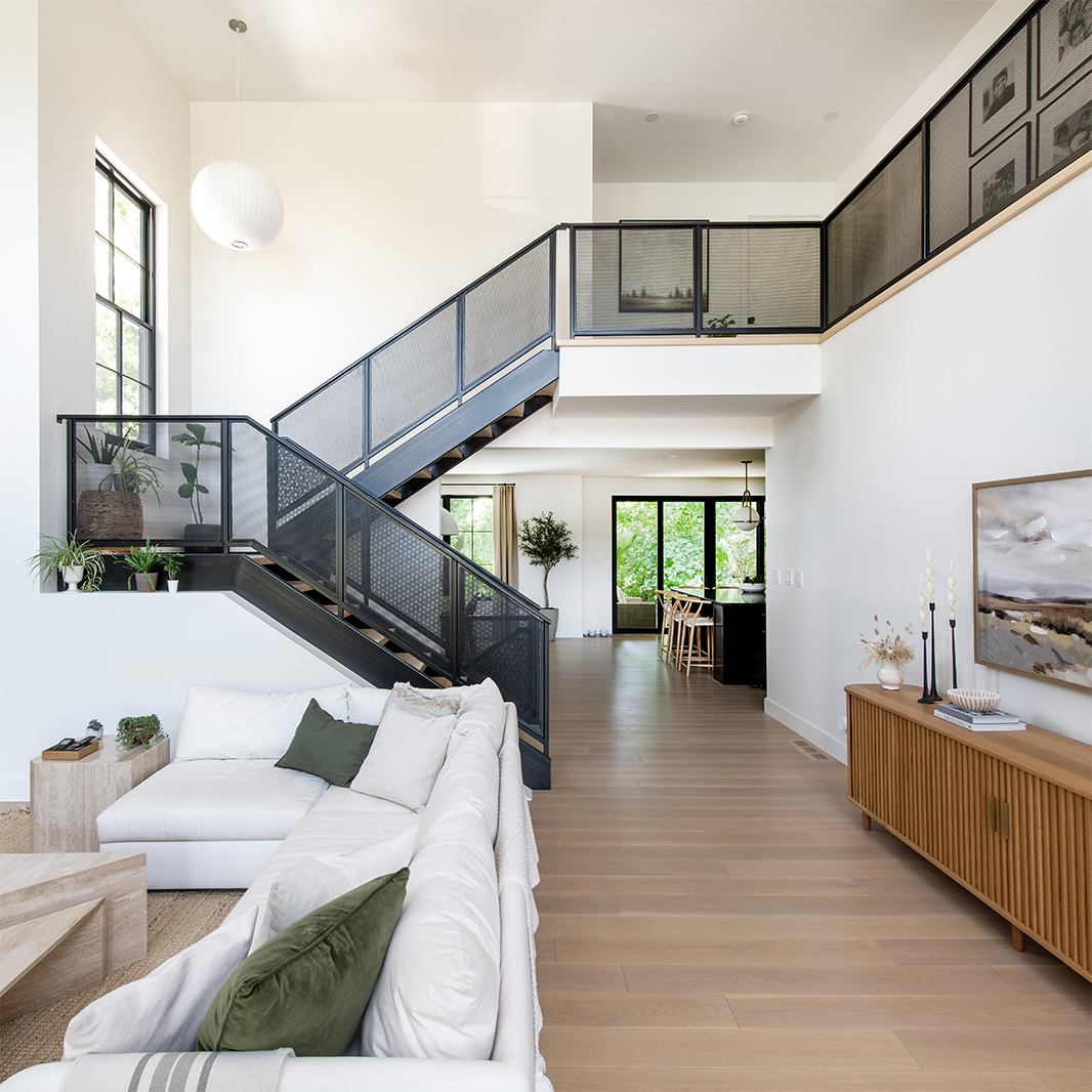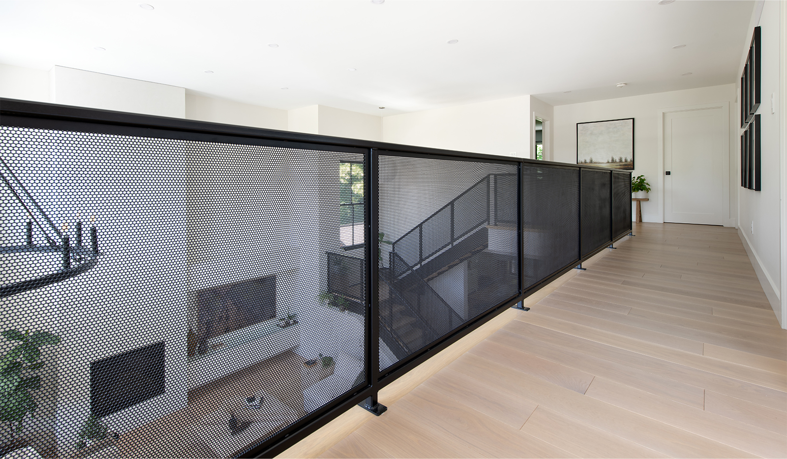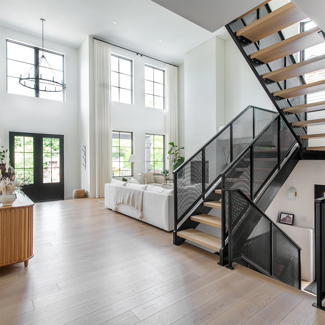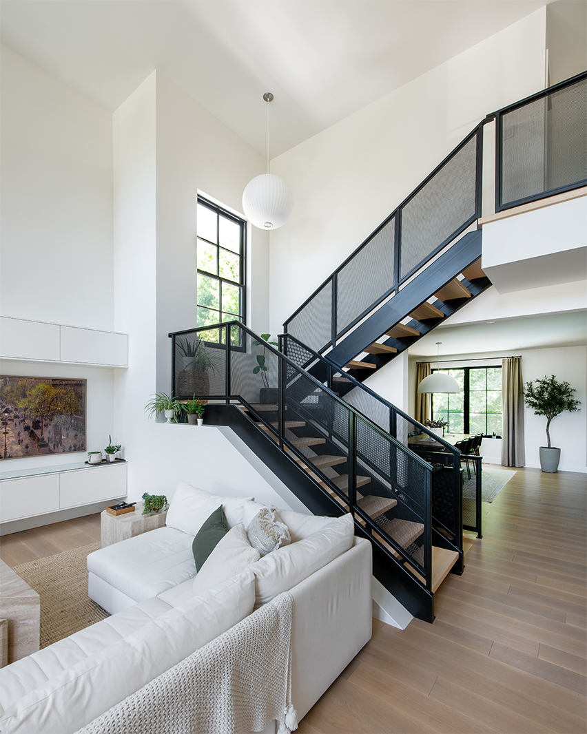 Crafted with steel closed stringers and white oak open riser steps, the staircase blends industrial strength with natural warmth. The clean geometry of the treads is matched by the precision of the custom-welded railing system, finished in a sleek semi-gloss black. Intricate mesh panels introduce texture and depth while preserving openness and visual flow throughout the space.