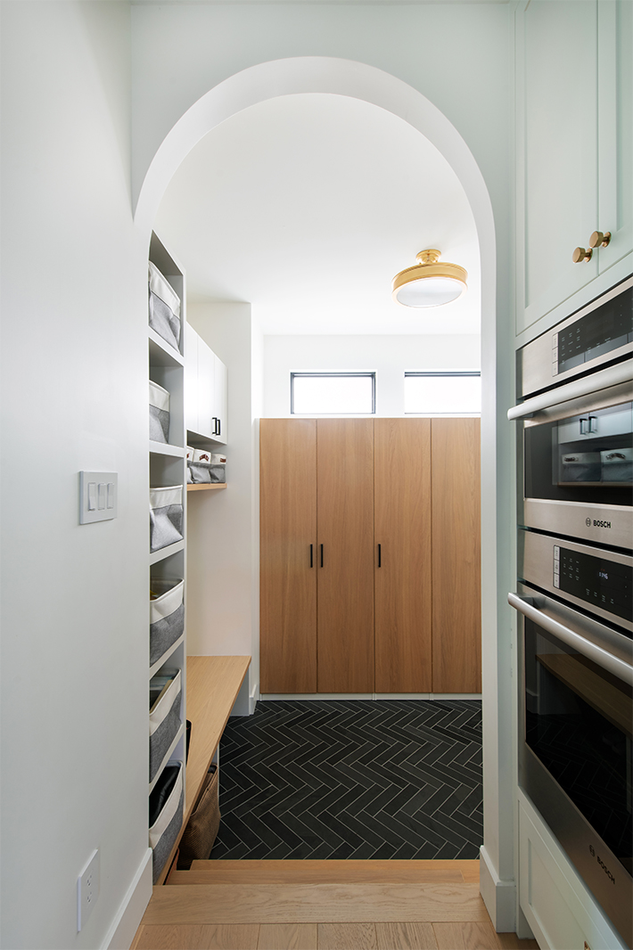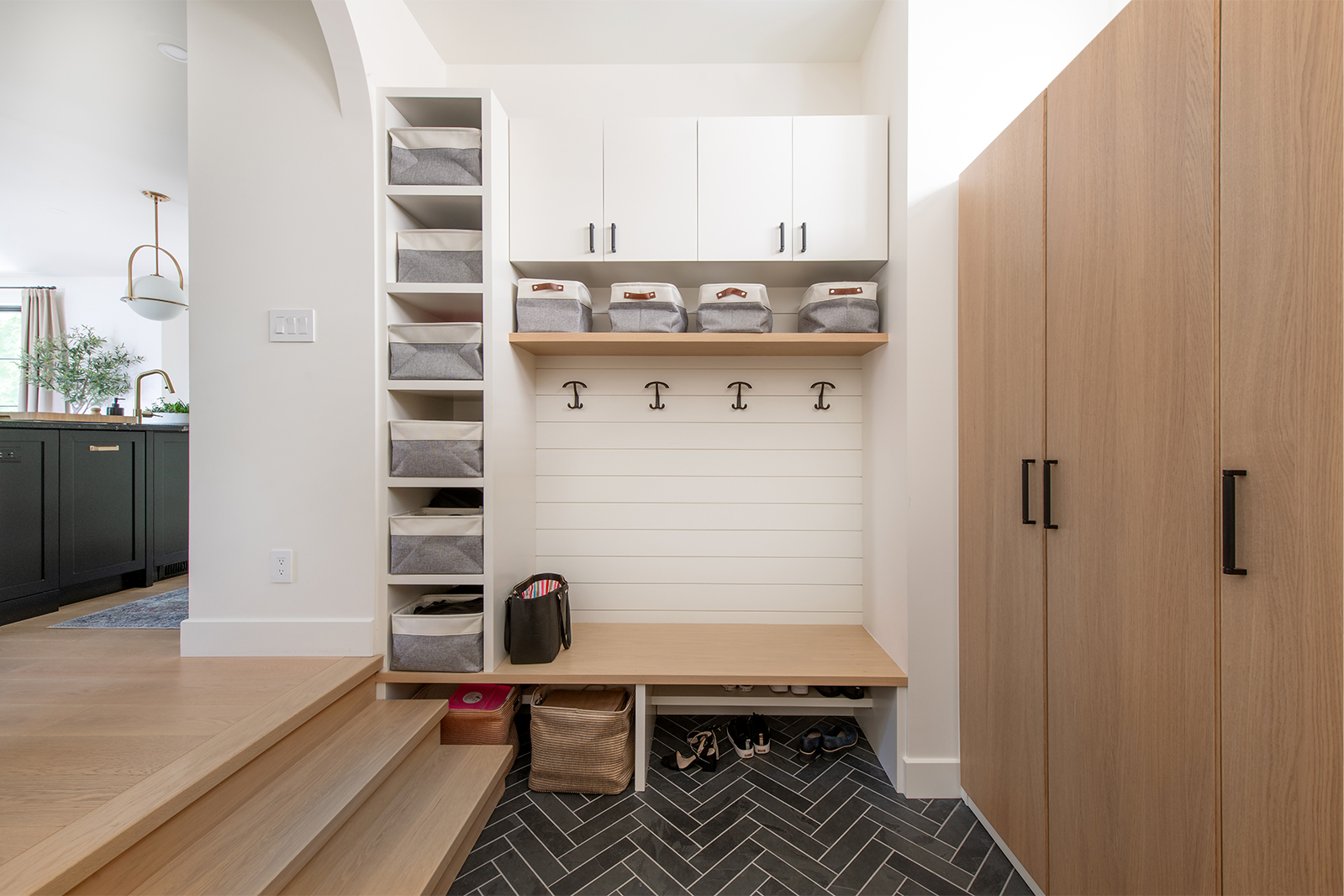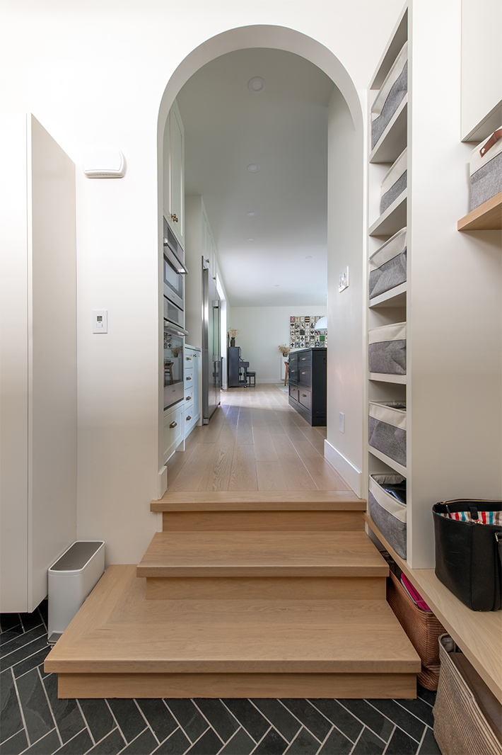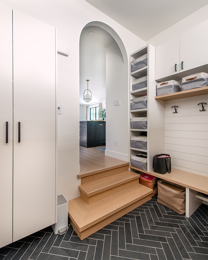 To complete the picture, the mudroom features smaller stairs with matching white oak treads, offering a warm and seamless transition that ties the entire space together.