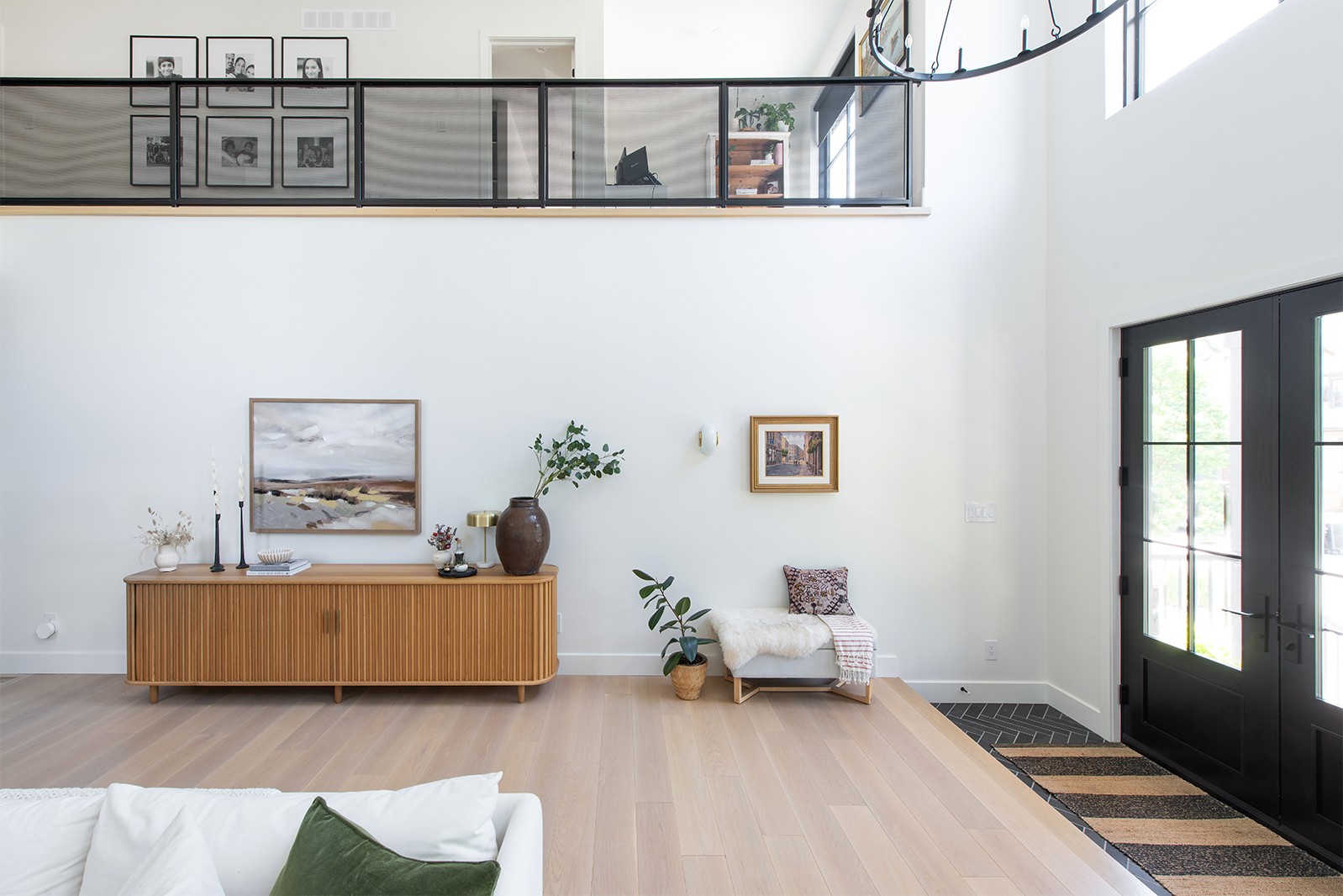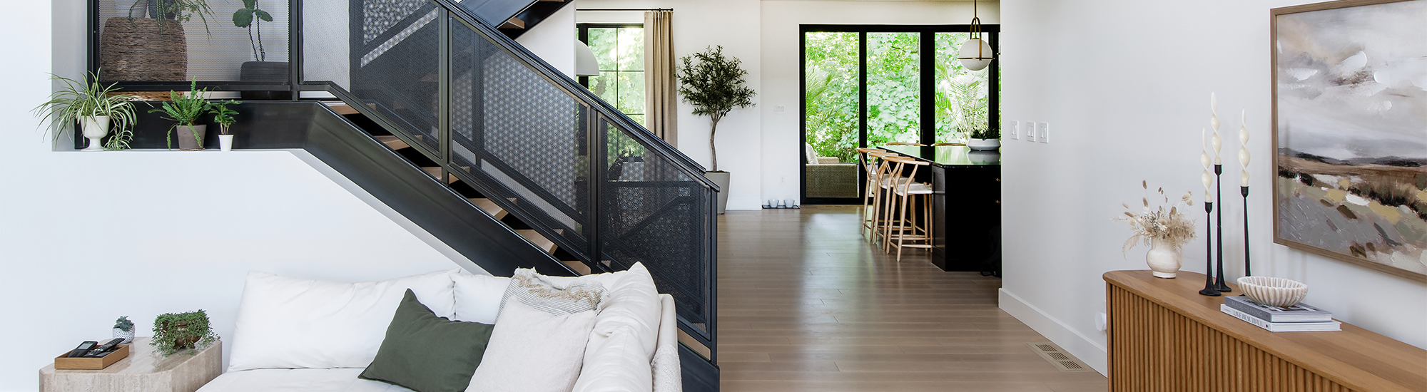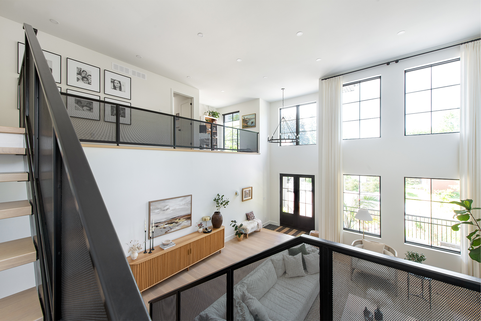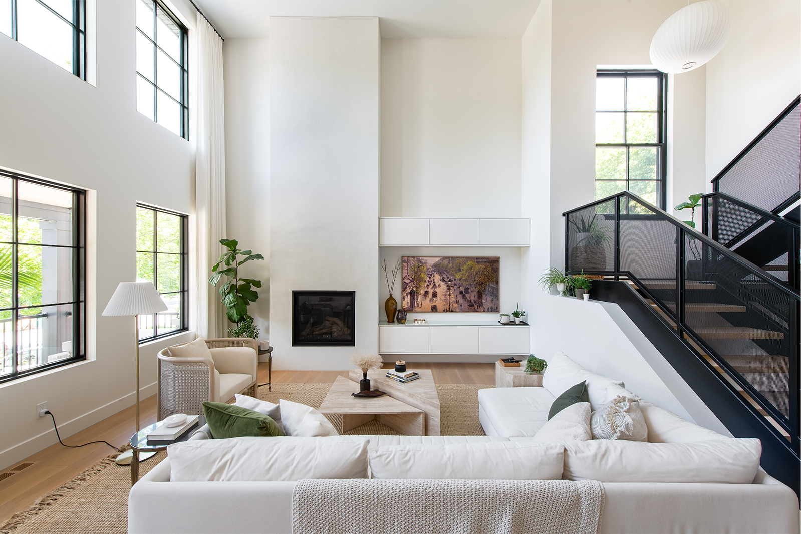 In this modern living space, the staircase is more than just a structural necessity; it’s a striking design feature that anchors the home with confidence and clarity.