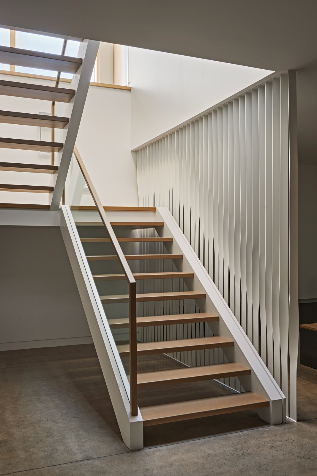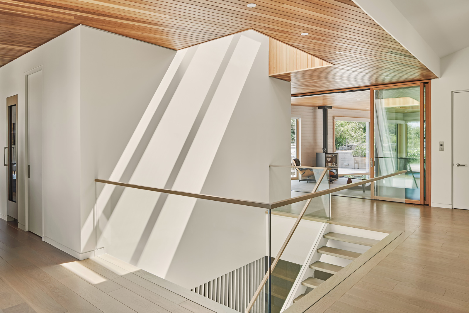 This project uses a slim profile rail that contours the glass to replace the traditional feature of a post and compliment the width of the wood panelling used for the ceiling. The glass railings are carefully placed on the floors and stringers to create a seamless appearance without needing hardware.