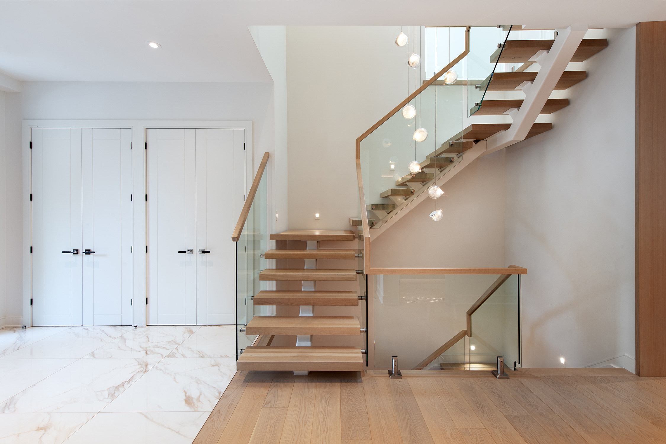 Completing the design is a 2” x 2” square white oak handrail featuring a groove atop the glass, adding a sophisticated touch to the overall look.