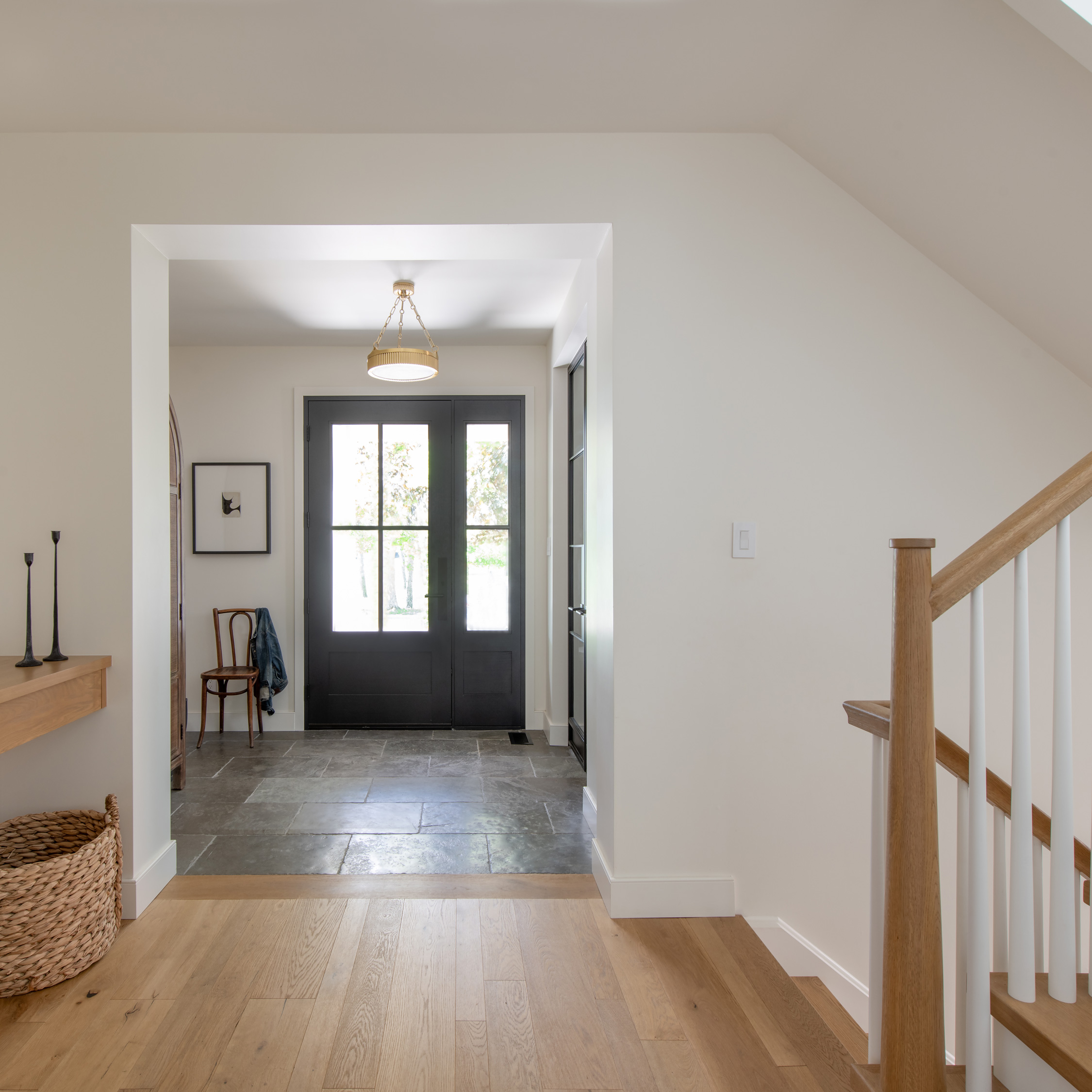This staircase is a stunning example of a growing trend we anticipate seeing more of in 2025: white wood spindles as a timeless and captivating choice. Paired with a custom railing design, this project features tapered posts and a colonial white oak handrail refined by eliminating the traditional bead detail, creating a clean and elegant finish.