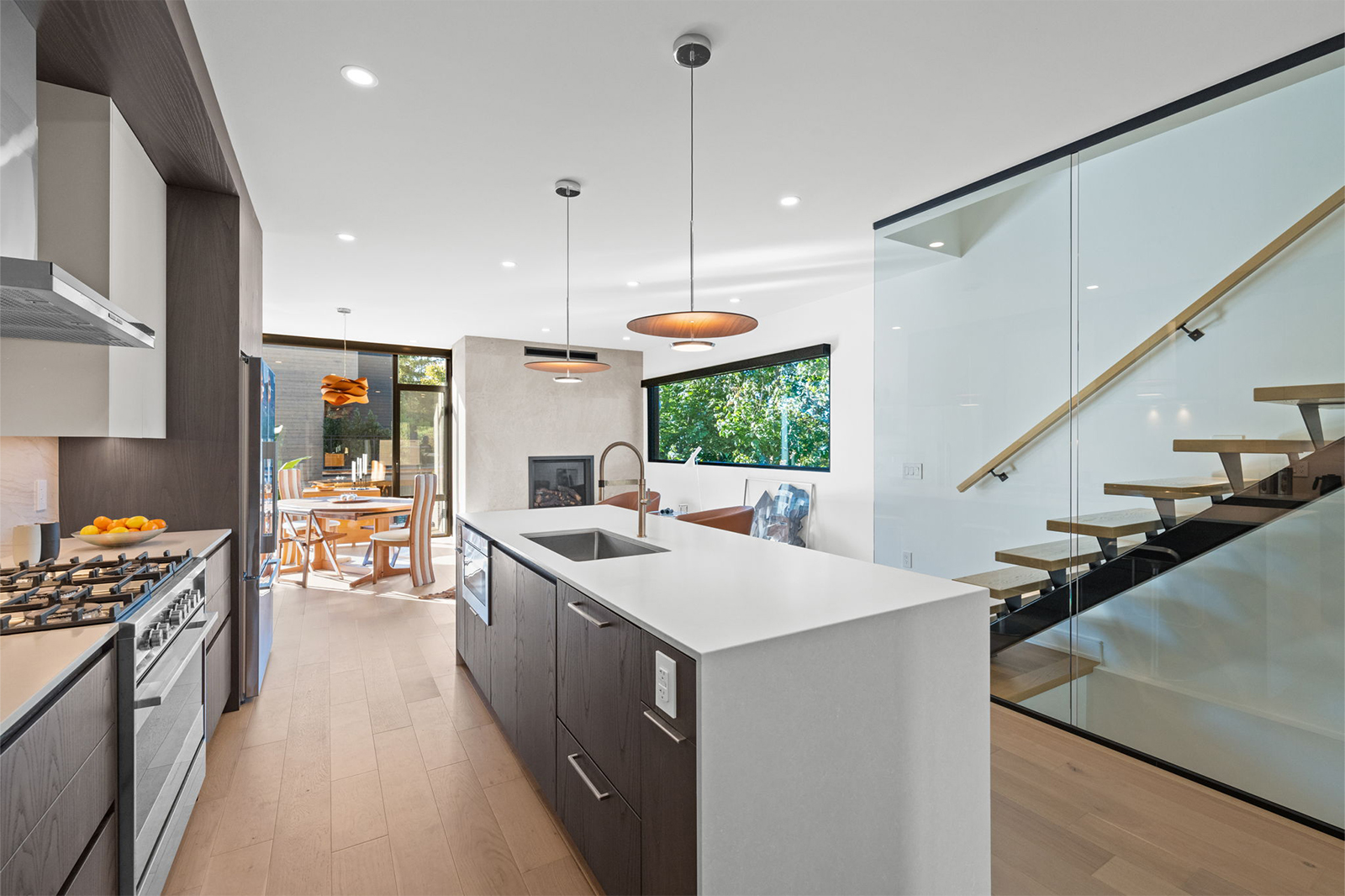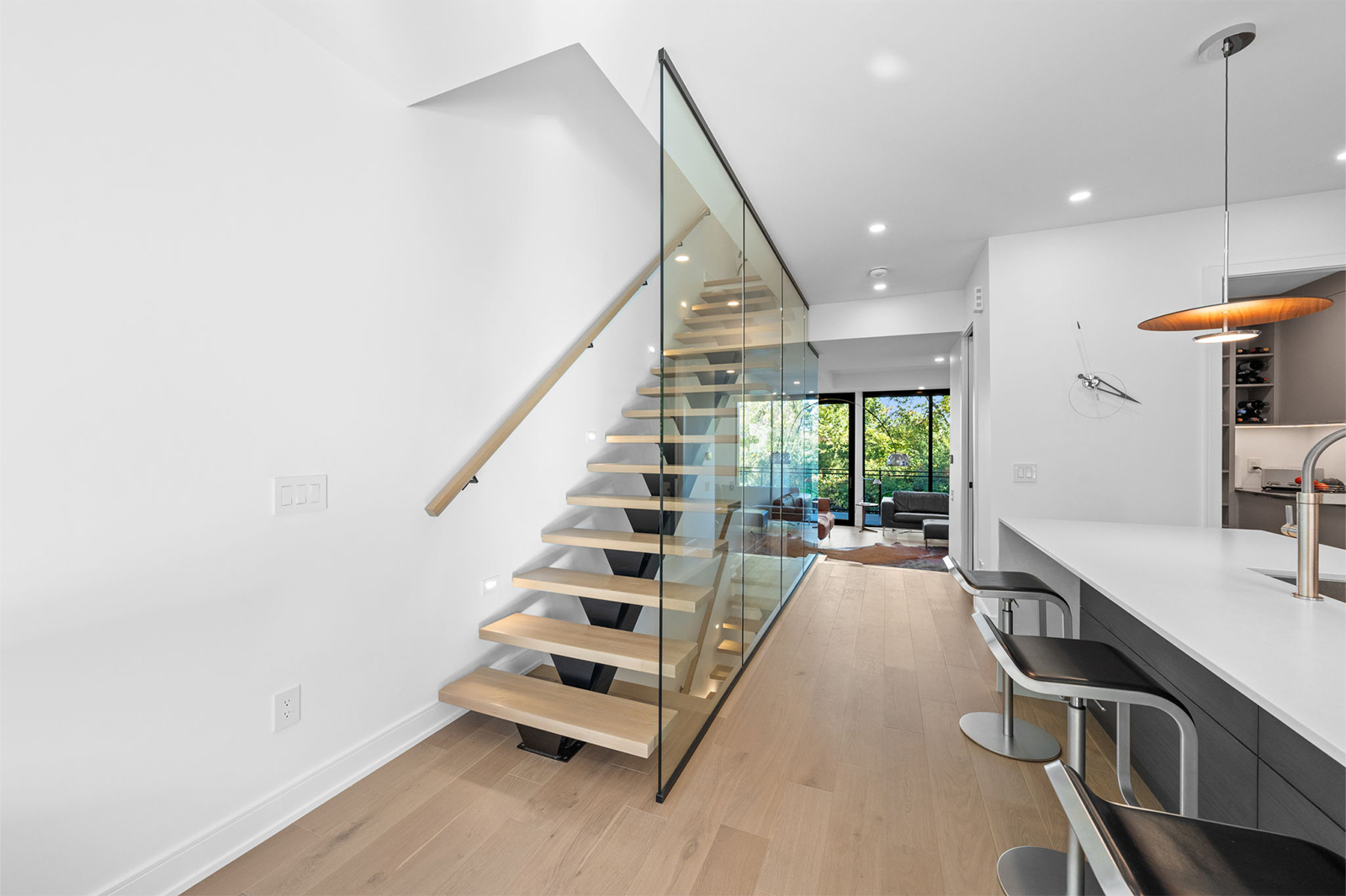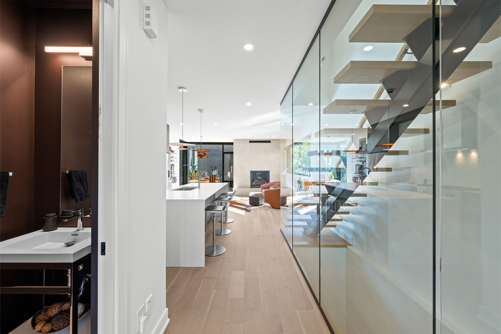 Built around a centre steel stringer, the floating white oak treads offer a clean, minimal profile while delivering strength and stability. Paired with floor-to-ceiling glass panels, the staircase creates a seamless connection between floors and allows natural light to move freely through the home.