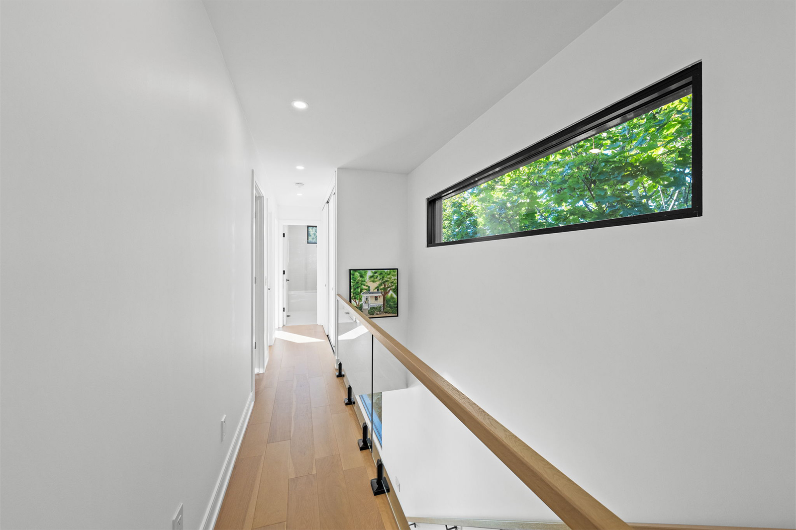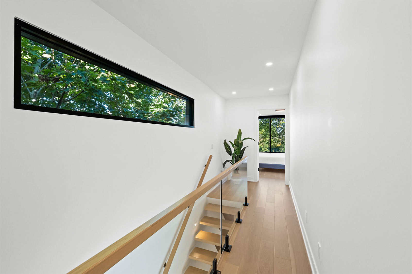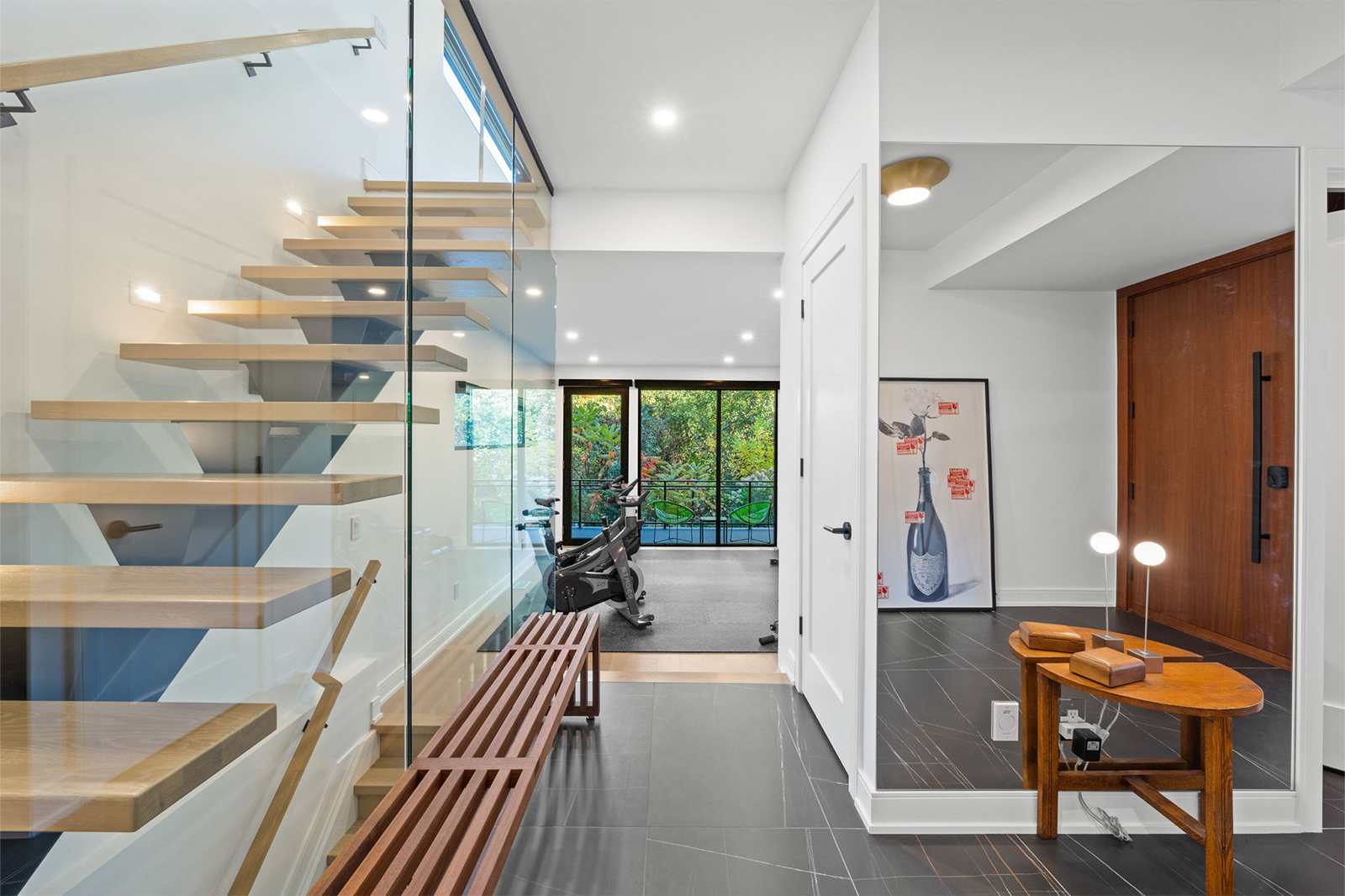 Built around a centre steel stringer, the floating white oak treads offer a clean, minimal profile while delivering strength and stability. Paired with floor-to-ceiling glass panels, the staircase creates a seamless connection between floors and allows natural light to move freely through the home.